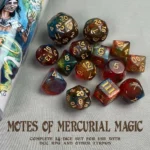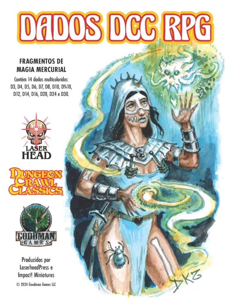 Este conjunto de 14 dados inclui: d3, d4, d5, d6, d7, d8, d10, d%10, d12, d14, d16, d20, d24 e d30.