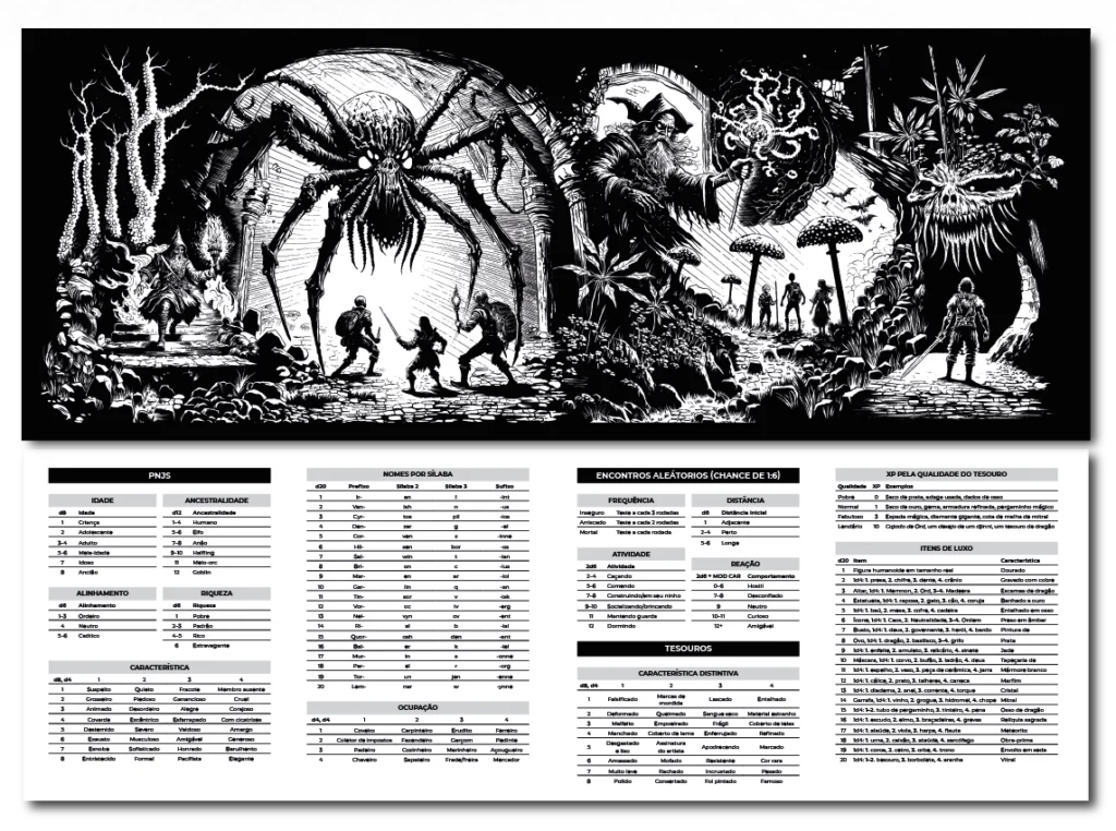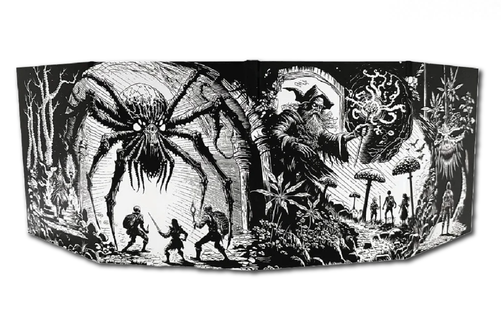 Quatro painéis com uma arte evocativa e, na parte interior, tabelas com regras que vão ajudá-lo a improvisar e manter o jogo fluindo. O escudo é dobrável, portátil e grande o suficiente para esconder todos os seus segredos de Mestre do Jogo, e pequeno o suficiente para ser transportado com facilidade.